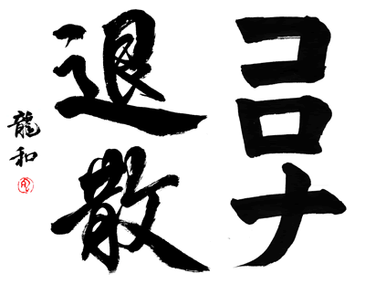 国際書芸協会 書道家・龍和殿から「コロナ退散」 の書を頂き社内に貼る |